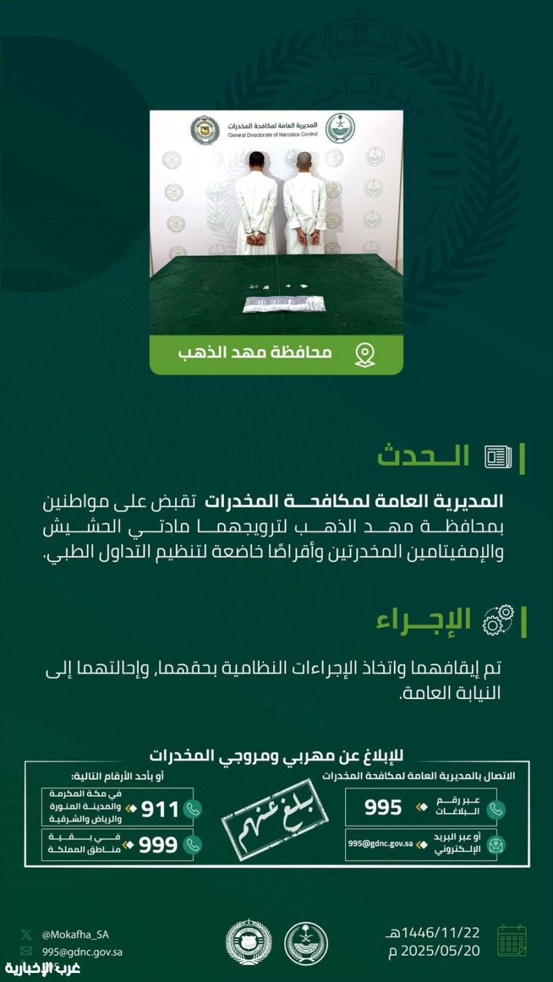 وأشارت المديرية العامة لمكافحة المخدرات إلى اتخاذ الإجراءات النظامية بحقهما، وإحالتهما إلى النيابة العامة.