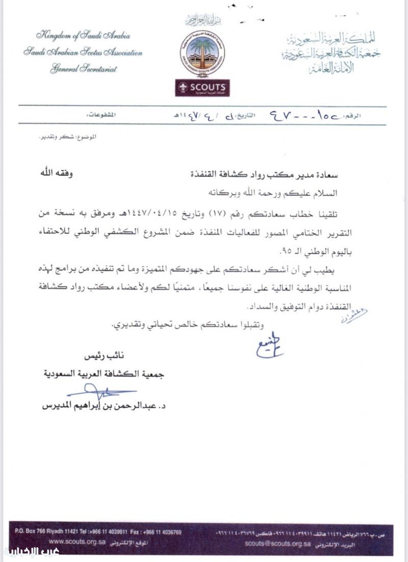 تلقى مدير مكتب رواد الكشافة بمحافظة القنفذة الاستاذ احمد الخيري ونائبه القائد الكشفي احمد الشيخي خطاب شكر وتقدير من سعادة الدكتور عبدالرحمن المديريس نائب رئيس جمعية الكشافة العربية السعودية، وذلك عقب اطلاعه على التقرير الإعلامي الخاص بفعاليات احتفاء المكتب باليوم الوطني الـ95 للمملكة العربية السعودية، والذي جاء متضمناً أنشطة وطنية ومجتمعية جسدت روح الانتماء والولاء لهذا الوطن المعطاء.