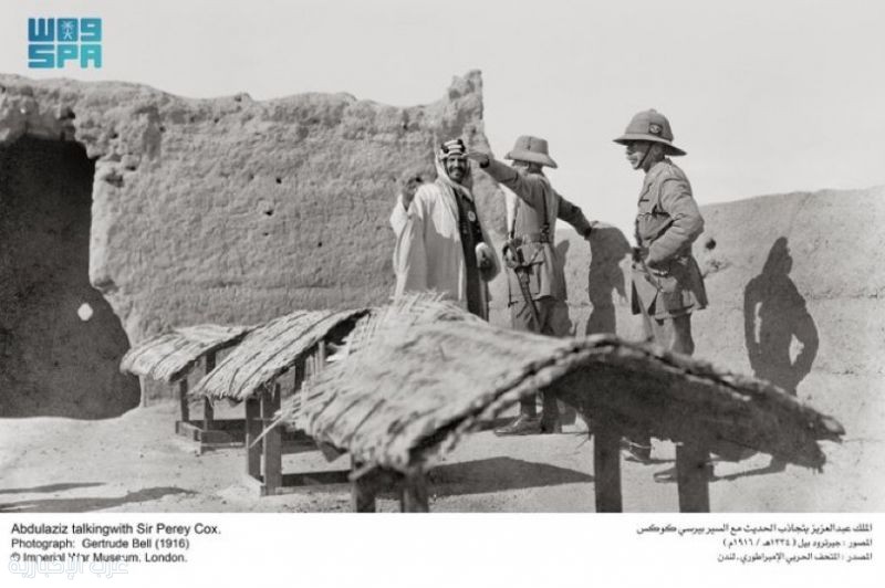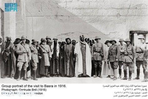وتُظهر إحدى الصور التي التقطتها المصوّرة البريطانية جيرترود بيل، الملك عبدالعزيز واقفًا بهيبة وجلال بين رجاله في صحراء البصرة، في مشهد تسجّله عدسة التاريخ شاهدًا على بُعد رؤيته، وحرصه على الحضور السياسي والدبلوماسي المبكر في المنطقة.