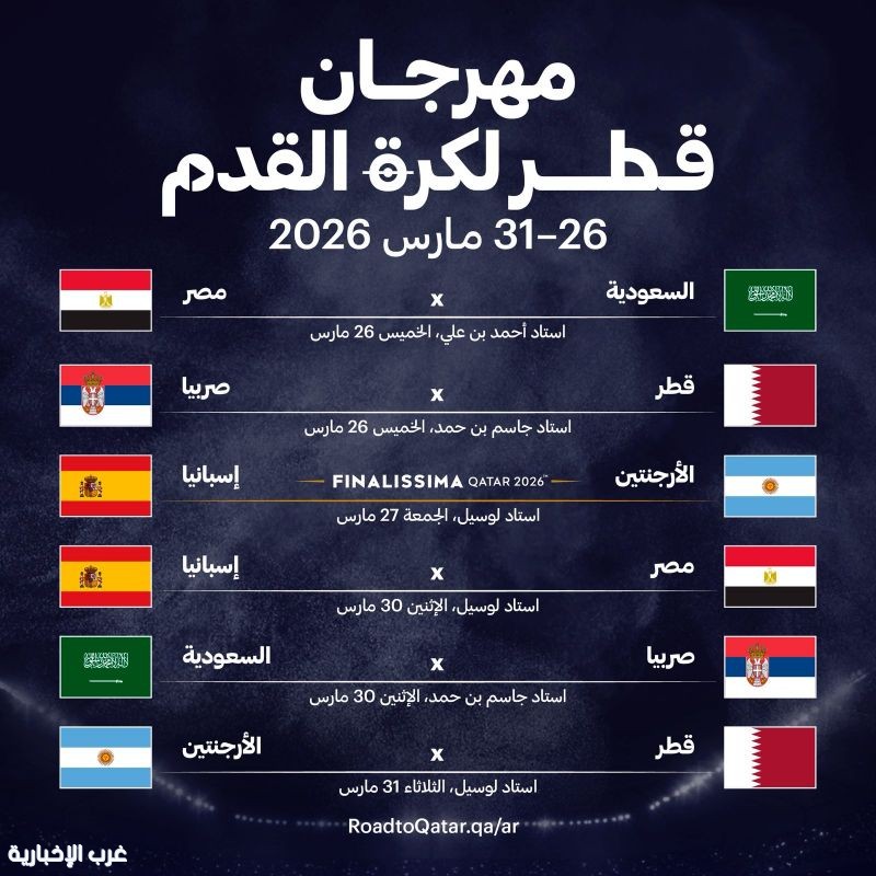 أعلنت اللجنة المحلية المنظمة لأحداث كرة القدم عن مهرجان قطر لكرة القدم 2026 الذي سيعقد خلال الفترة من 26 إلى 31 مارس. وسيضم المهرجان مباراة كأس فيناليسيما 2026، إلى جانب عدد من المباريات الدولية التي تجمع نخبة من المنتخبات استعدادًا لمشاركتها في بطولة كأس العالم قطر 2026™️، بما يتيح لها الوقوف على جاهزيتها الفنية والتنافسية قبل انطلاق الحدث العالمي المرتقب.