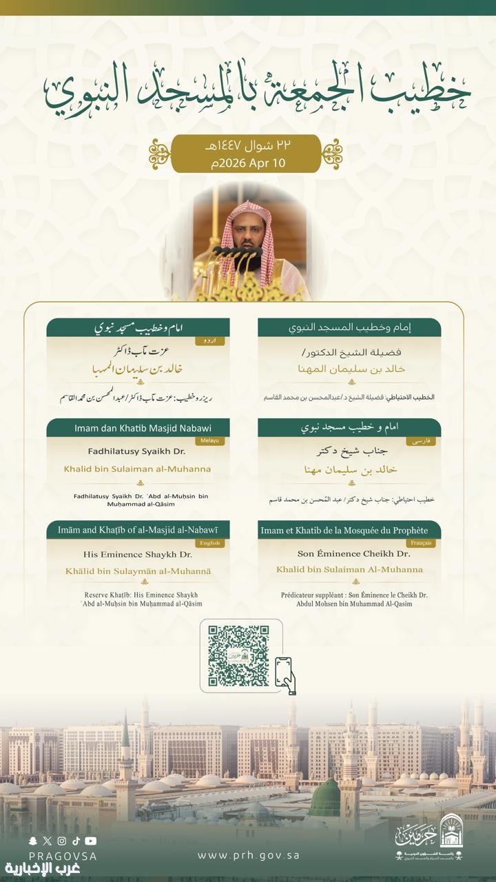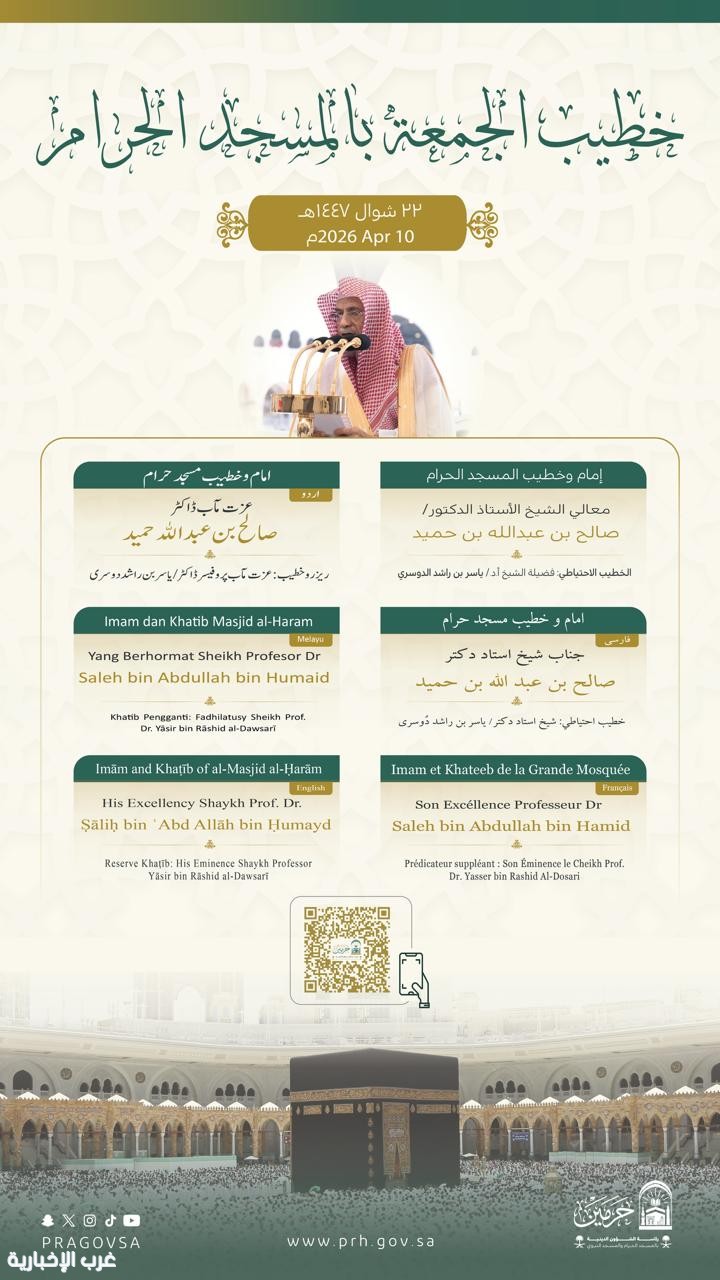 أعلنت رئاسة الشؤون الدينية بالمسجد الحرام والمسجد النبوي أسماء خطيبي وأئمة صلاة الجمعة في الحرمين الشريفين ليوم 22 شوال 1447هـ، وذلك ضمن جدولها الدوري لتنظيم الإمامة والخطابة.